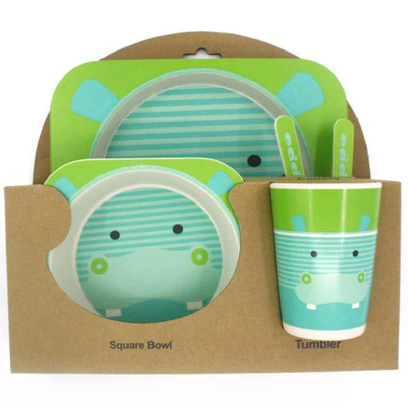 ORIGINAL 5Pcs/Set Cartoon Animal Plate+Bow+Fork+Cup Baby Dinnerware Feeding Set Bamboo Fiber Baby Lovely Chi